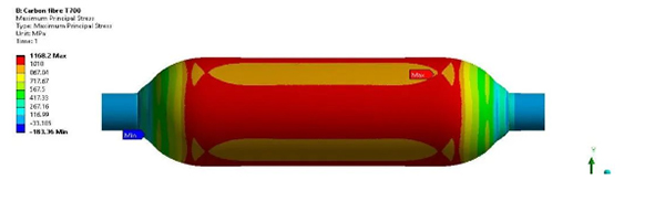 结果显示:S玻璃纤维IV型瓶变形量为10.873mm,T700级碳纤维IV型瓶变形量为10.176mm,KevlarIV型瓶变形量为1.0845mm;三者的弹性应变分别为0.26812、0.25658和0.073177。此外,S玻璃纤维IV型瓶的最大主应力为1105.9MPa,碳纤维IV型瓶的应力为1168.2 MPa, Kevlar IV型瓶的应力是1389.4MPa。研究指出,在应力和应变可接受的范围内,芳纶纤维是一种适用于氢气压力容器的材料。