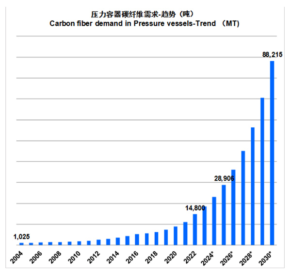 数据显示,2022年全球碳纤维市场规模达到43.86亿美元,同比增长29.0%,全球碳纤维需求为13.5万吨,相比2021的11.8万吨增长14.4%。在“双碳”政策驱动下,压力容器市场增长迅速,2022年全球压力容器需求达到1.48万吨,较去年增长34.5%,细分市场中占比11.0%,预计到2030年,全球压力容器需求将超过8万吨,增长趋势强劲。