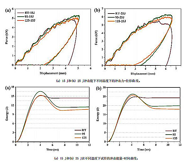 使用冲击测试仪和传感器中获得的冲击参数包括时间、力、能量、位移和速度等,利用“力-位移”与“能量-时间”的关系图可以测试CF/PPS层压板样品的刚度、最大冲击力、最大位移、冲击能量、吸收能量等数据效果。分别在不同温度(室温、95℃和125℃),不同冲击能量(5J、15J、25J和35J)下进行多组对照测试,明确不同条件下CF/PPS层压板在冲击行为下,是否出现损伤、损伤模式、冲击形成的表面压痕大小和深度等,通过实测数据和结果,尽可能还原冲击环境下热塑性碳纤维复合材料制品受温度影响的真实情况。