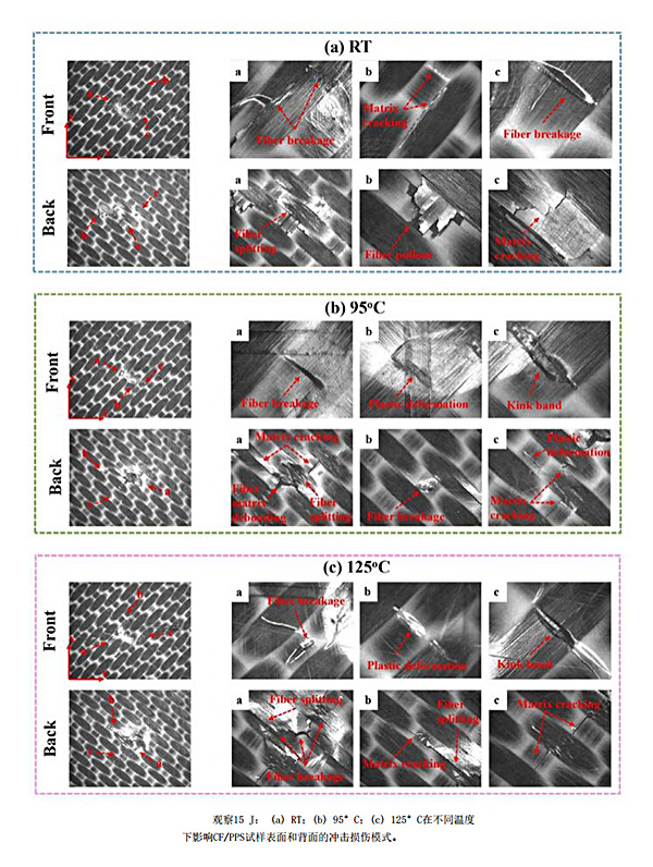 3、温度对CF/PPS层压板外部损伤的影响:冲击能量为15J的状态下,室温下CF/PPS层压板受冲击后正反两面的损伤并不严重,损伤模式为少量纤维断裂、正面基体裂纹、纤维拉出和背面基体裂纹;在95℃下,CF/PPS层压板发生玻璃化转变,正面的纤维以韧性方式断裂,且基体有塑性变形和扭结带,背面纤维分裂更明显,但纤维断裂和基体裂纹反而更小;在125℃下,CF/PPS层压板正面基体变软,纤维交叉处塑性变形和纤维断裂更明显,但由于富树脂区域的存在,裂纹无法传播,背面有明显纤维断裂和分裂的情况,其中翘曲纤维的弯曲应力超过自身承受极限,损伤较95℃样本更严重一些,但较室温样品更轻微一些。