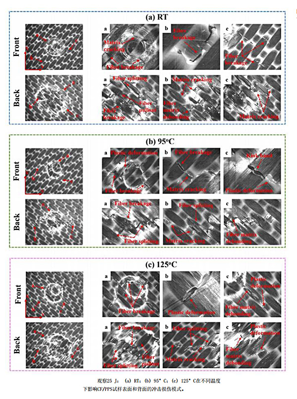 当冲击能量提升至25J后,CF/PPS层压板的损伤程度更严重,而且损伤模式更复杂。在室温状态下,正面有大量纤维断裂和基体开裂,背面有纤维分裂、纤维断裂、纤维拉出、基体开裂和纤维基体脱粘;但随着温度提升,层压板出现塑性变形和扭结带,整体损伤较室温样品更轻微,但研究发现95℃和125℃的样品的损伤明显沿横向传播,0°和90°方向的翘曲纤维承受较大应力,发生更明显的塑性变形。