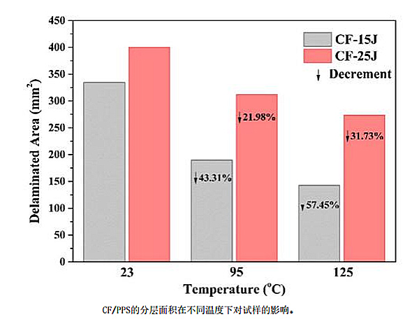4、温度对CF/PPS层压板冲击损伤分层面积的影响:在任何温度下,25J冲击能量下的分层面积都大于15J冲击能量下的分层面积,而在相同冲击能量下,温度越高,分层面积越小。15J冲击能量下,95°C和125°C时的分层面积值分别降低了43.31%和57.45%;而25J冲击能量下,95°C和125°C时的分层面积值分别降低了21.98%和31.73%。对比15J和25J两组冲击能量样品,冲击能量低的一组,温度对分层面积有更好的抑制作用。