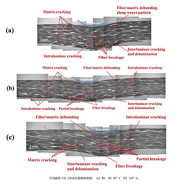 5、温度对CF/PPS层压板内部损伤的影响:冲击能量15J状态下,室温下[±45]层的平面外剪切纤维束中可发现45°基质裂纹,冲击侧附近的[0,90]层的卷曲附近产生纤维基体脱粘,脱粘裂纹沿着编织模式传播,并由于纤维桥接机制而被阻止,在未受冲击侧附近的[±45]层中也很少观察到层内裂纹;95℃下在[±45]层平面外剪切纤维束和树脂丰富的区域都可以观察到裂纹,其主要原因是由于基体的延性增强,导致复合材料在冲击器下靠近非冲击侧的区域发生塑性变形;125℃下,在[±45]、[0,90]层平面外剪切纤维束和树脂丰富的区域可以看到许多基体裂纹,受冲击侧附近的裂纹方向为45°,而非受冲击侧附近的裂纹方向接近90°,表明非受冲击侧附近有明显的塑性变形。