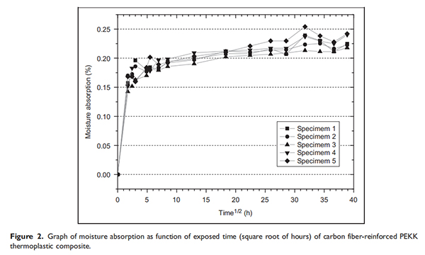 1、吸湿率提升过程:CF/PEKK层压板在80℃和90%湿度的环境中,自身重量随着暴露时间的增加而提升,但提升是有上限的,这种提升是因为吸收了一定的水分。通过对测试过程的观察,发现前6个小时,吸水量快递上升,吸湿率达到0.18wt%,在随后的50天内缓步达成饱和状态,最大吸湿率0.23wt%左右。