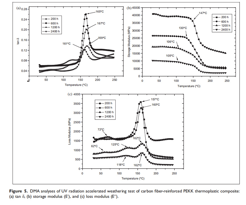 3、紫外线辐对粘弹性能和Tg的影响:将CF/PEKK层压板样品置于紫外线环境中,分别照射200、600、1200和2400小时。能量损耗率(tanδ)数据显示,损耗达到顶点时,Tg分别是161℃、165℃、169℃和167℃,200小时时Tg相对较低,其他3个时段都稍高一些。