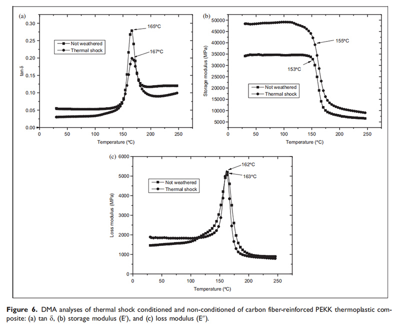 国外专业论文中,实验过程中选择温度、湿度(水分)和紫外线为基础的环境因素,通过调节后形成参照对比,对CF/PEKK复合材料样品进行长时间的测试,利用动态力学分析(DMA)的方式记录CF/PEKK层压板的粘弹性能和玻璃化转变温度(Tg)的变化数据,并推导对应的结论。