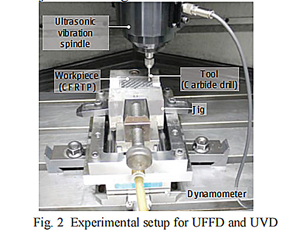 2、超声波振动钻孔(UVD):将压电晶体振荡器安装在设备上,提供70kHz的恒定频率,观测超声波振动在对热塑性碳纤维层压板钻孔的实际效果。