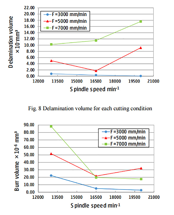 2、分层和毛刺情况:利用3D测量显微镜观察发现,分层和毛刺出现与钻孔的入口方向,以20μm为分界线进行区分。当进给速度为3000mm/min时,主轴转速无论高低都没有出现分层。当进给速度高于3000mm/min,主轴转速超过20000min-1时,分层体积随进给率的提升而增加,这是因为高进给速度下的推力更大。
