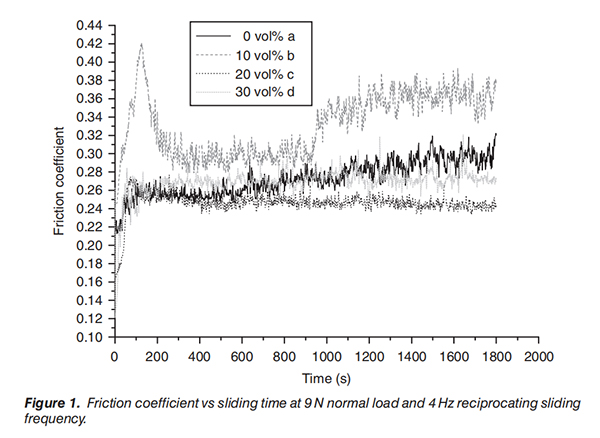1、9N载荷力和4Hz摩擦频率下的摩擦系数数据:在9N载荷力和4Hz摩擦频率条件下,记录1600s滑动时间内的数值。发现纯PA试样的摩擦系数随着时间增加而迅速增大;20和30vol%的CF/PA复合材料试样的摩擦系数呈现抛物线形状,随时间增加而增大;10vol%的CF/PA试样摩擦系数随时间增加先增大,然后下降到稳定状态,随后又突然增大。
