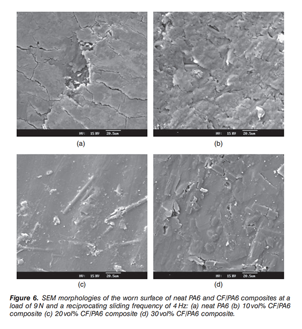 5、摩擦损伤表面电镜扫描结果显示:纯PA试样(图a)有明显微裂纹和剥离,CF/PA试样(图b、c和d)这种情况较少,甚至没有,说明碳纤维的加入,显着的降低了摩擦磨损的可能性。10vol%体积占比的CF/PA6试样(图b)在纤维和树脂的薄弱点有微裂纹,说明低含量的碳纤维的耐磨性较弱;而20 vol%体积占比的CF/PA6试样(图6c),摩擦磨损较少,碳纤维有效支撑了载荷力,防止碳纤维和树脂的剥离;30vol%体积占比的CF/PA试样(图d)基体有一个垂直于滑动方向的大裂纹,这是邻近填料分离后形成的。
