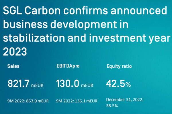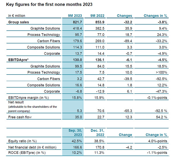 2023年11月2日,该公司发布2023年前三季度财报。由于石墨解决方案、工艺技术和复合材料解决方案业务部门的销售和盈利发展好于预期,SGL Carbon的综合销售额达8.217亿欧元,仅比去年同期的8.539亿欧元低3.8%。因此,碳纤维部门持续疲软的业务发展几乎可以在集团层面得到弥补。